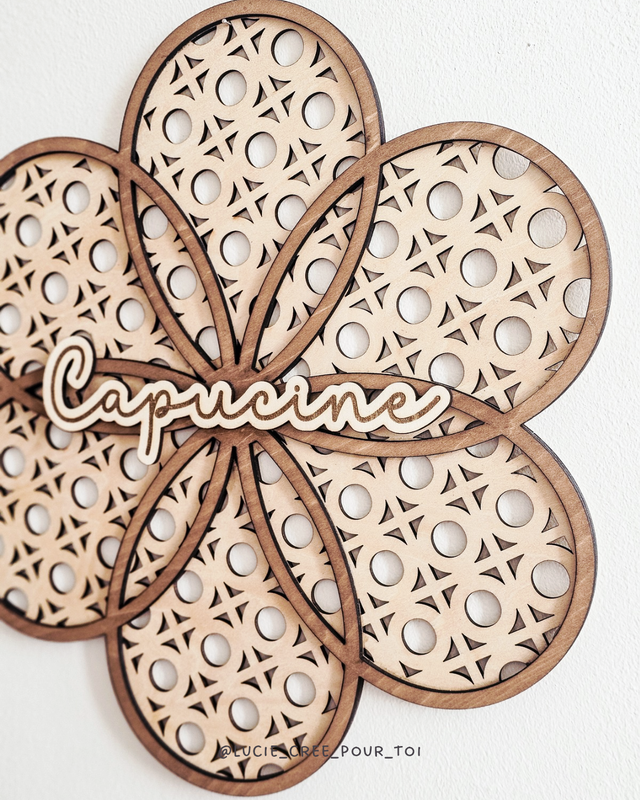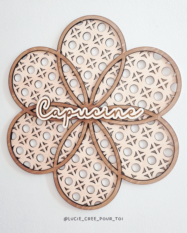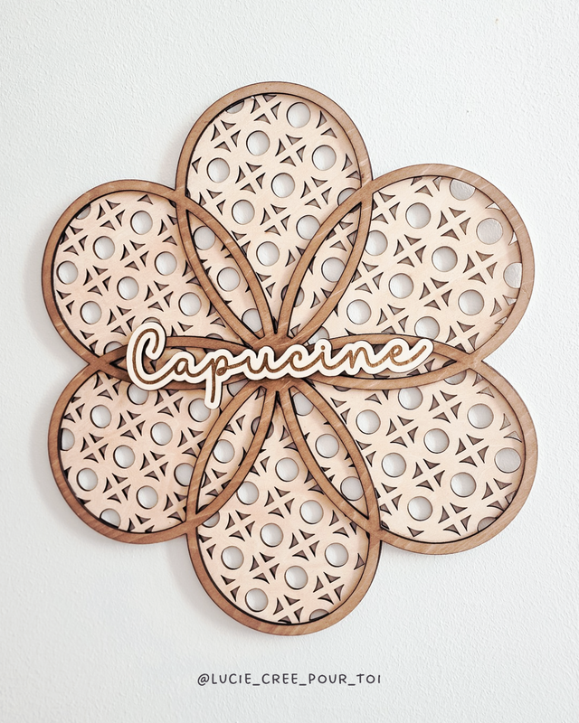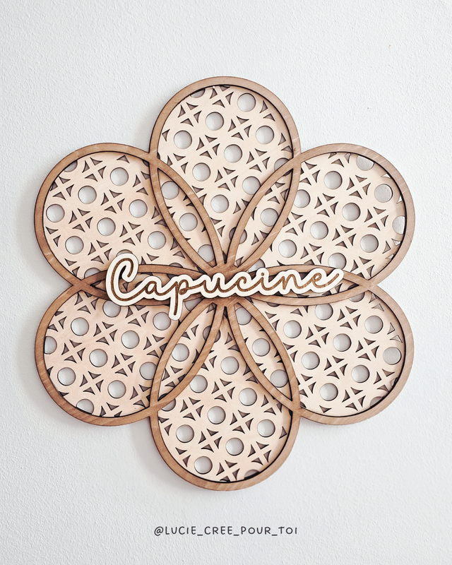 Apporte une touche naturelle et chaleureuse à la décoration avec cette suspension murale effet cannage en forme de fleur, personnalisée avec le prénom de ton choix.