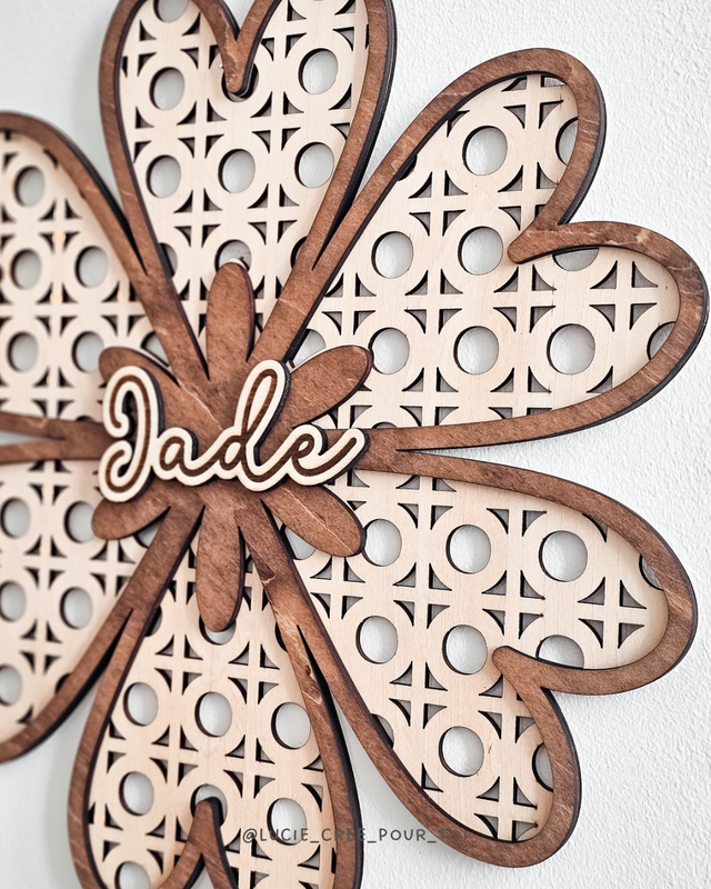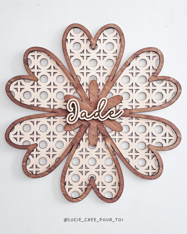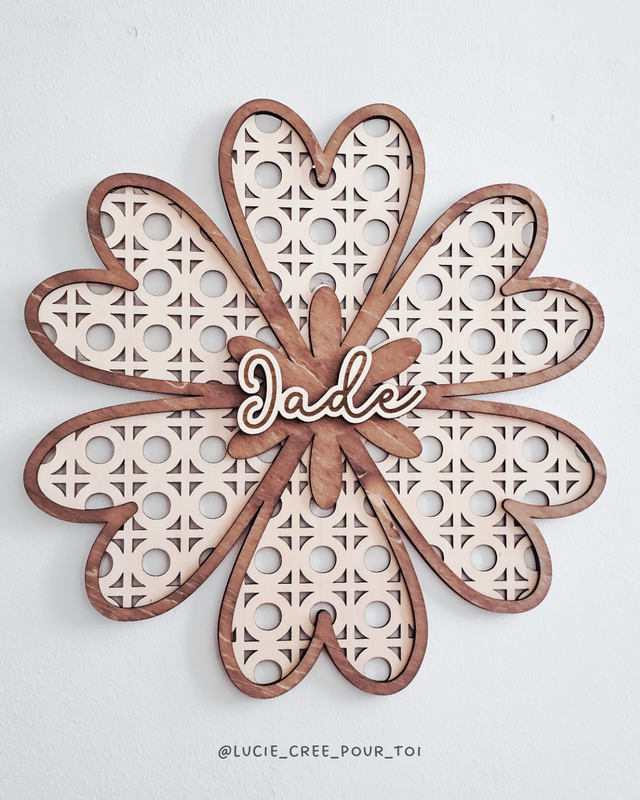 Apporte une touche naturelle et chaleureuse à la décoration avec cette suspension murale effet cannage en forme de fleur, personnalisée avec le prénom de ton choix.